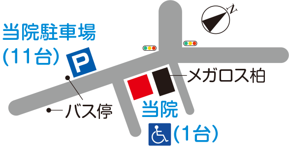 柏6丁目バス停下車、右斜め向かいが当院です。